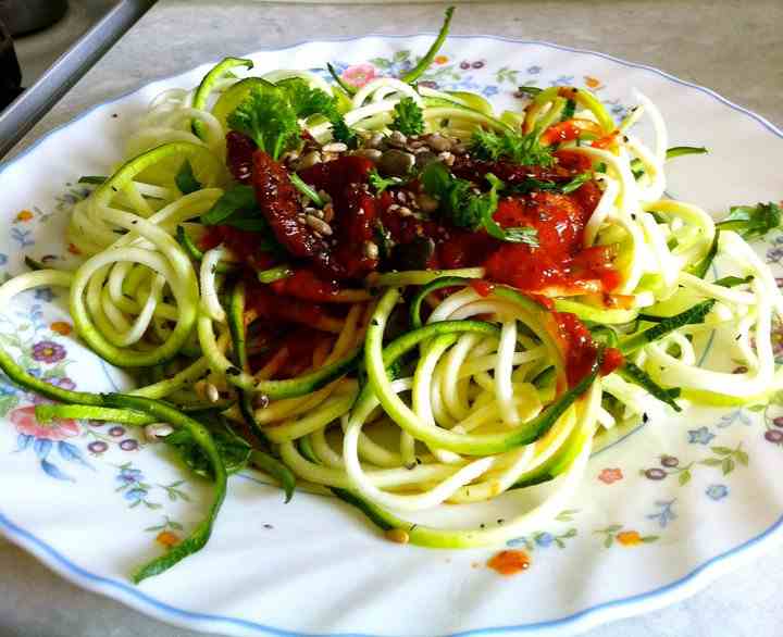 meal - raw courgette spaghetti spirals and Italian tomato sauce, yummy!